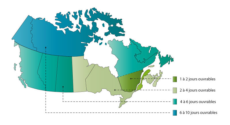 Le temps d'expédition est calculé à partir du moment où le colis quitte notre département d'expédition et jusqu'à ce qu'il parvienne à sa destination. Le tableau ci-bas vous donne un approximatif de nos délais de livraison habituels.